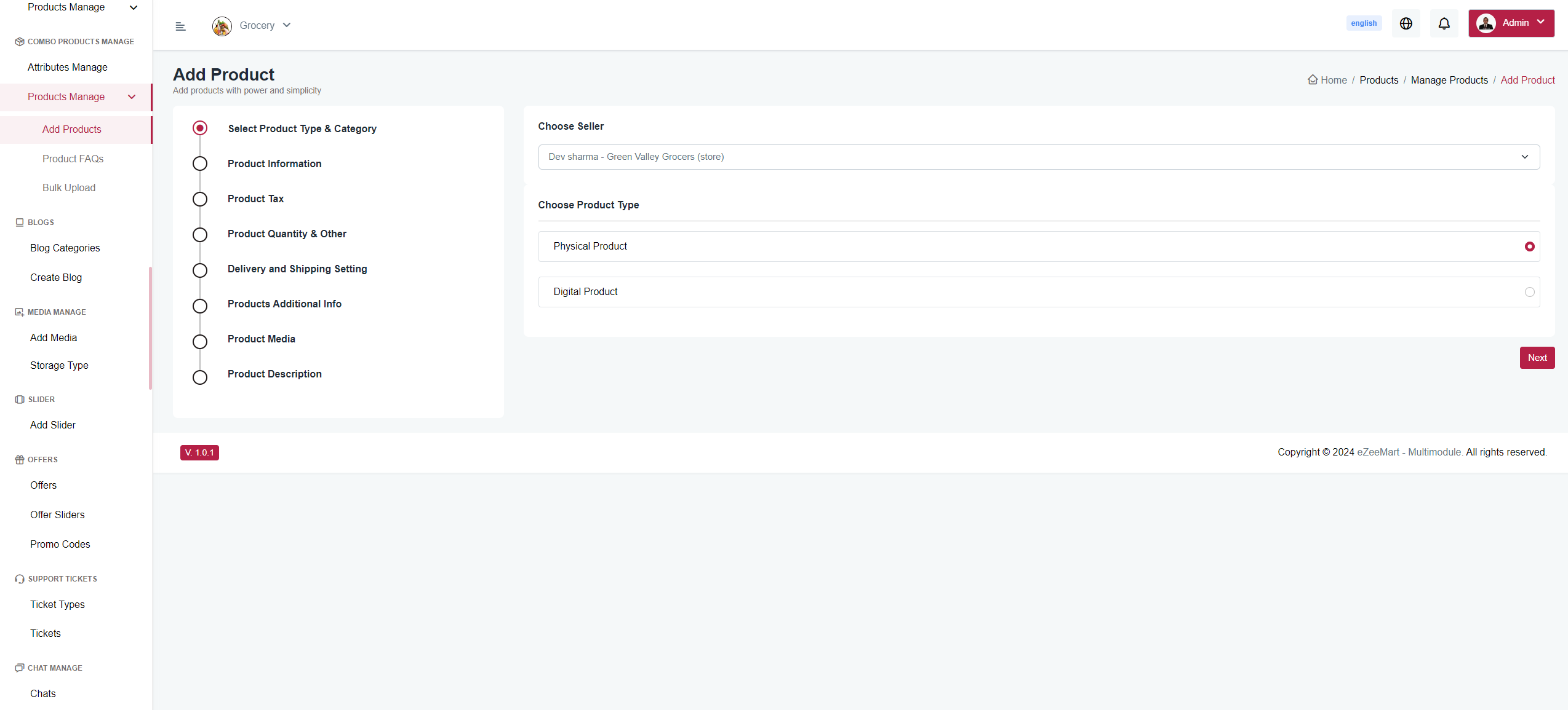 You can create a product that contains basic details like name, description, category, brand, origin ,physical or digital product, tax information, and image. Additionally, you can set product deliverability and shipping settings, manage stock of products, and create variable products